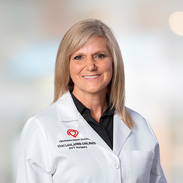 Vicki R. Leist, APRN-CNS, RNFA, specializes in cardiovascular and thoracic (CVT) surgery at Oklahoma Heart Institute. Her professional areas of interest include nutrition and glycemic control in cardiothoracic patients.